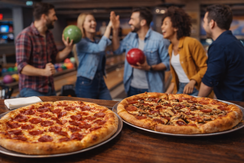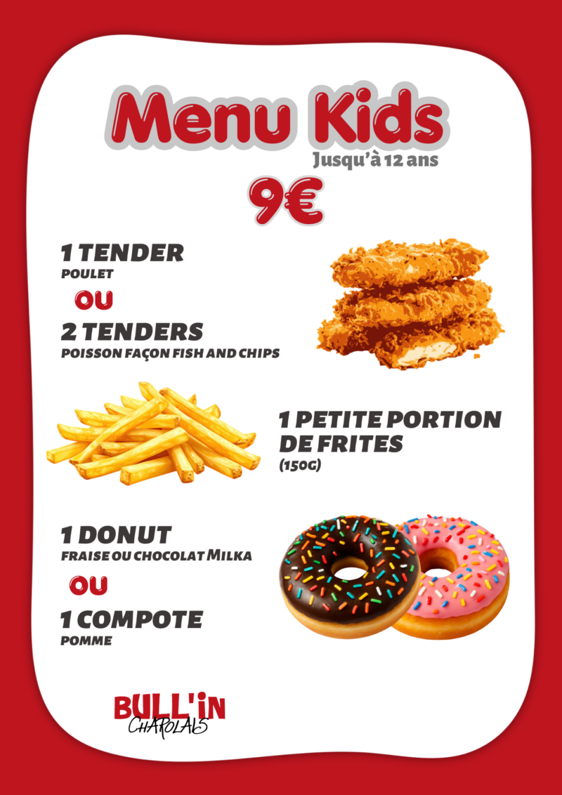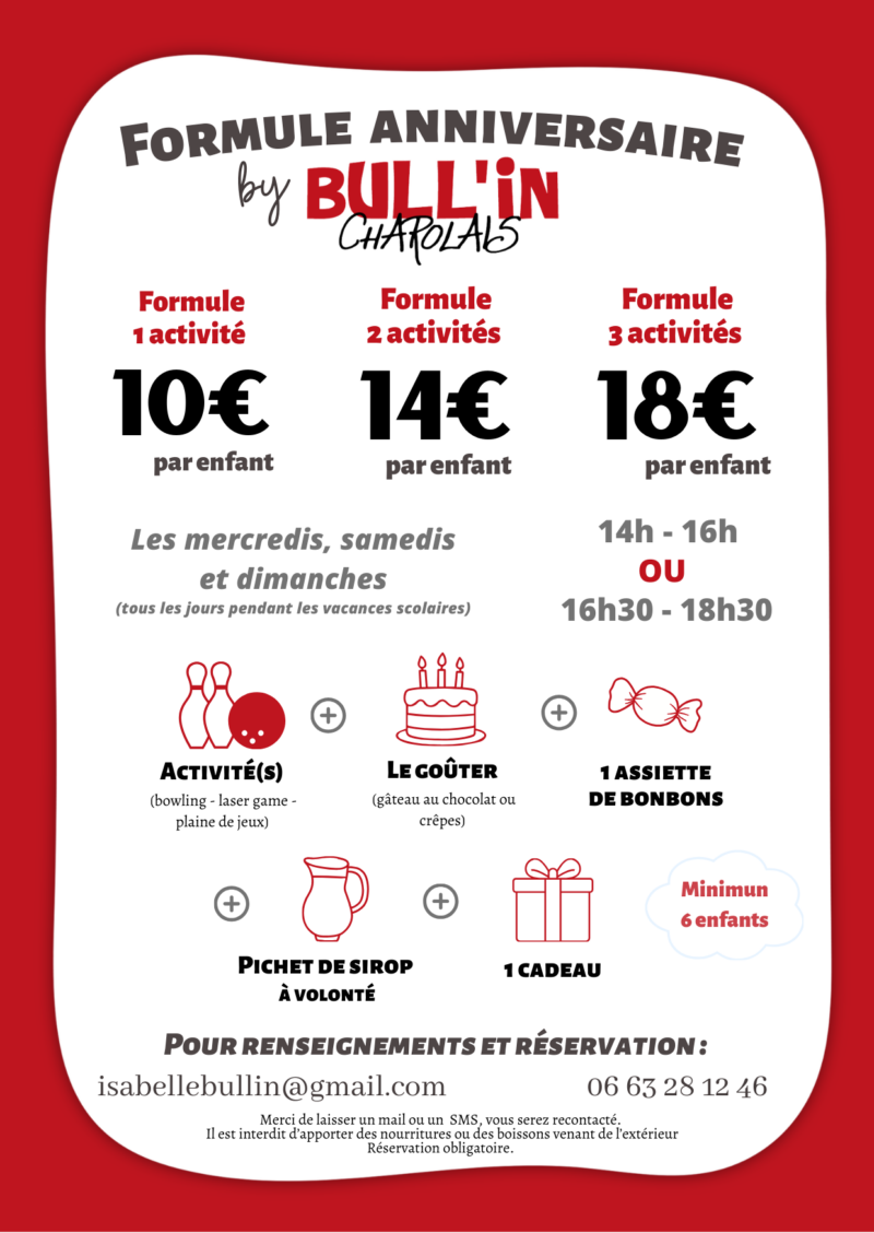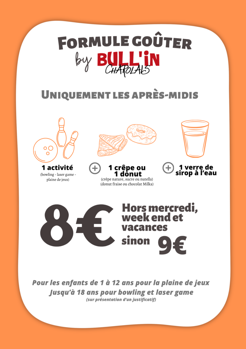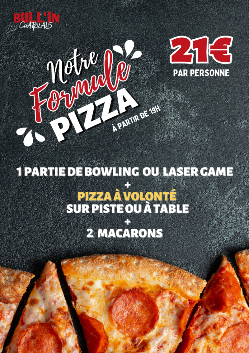 Formule enfant : 1 bowling ou Plaine de jeux + 1 petite pizza jambon fromage ou 1 tender poulet et frites = 12€/enfant (+1,50€ le dessert compote de pomme ou donuts)